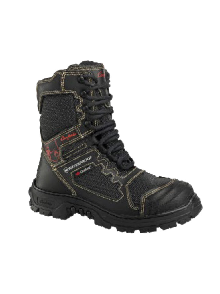 Safety boot, mid-calf, antistatic, reghter model, made of water-repellent and re-resistant leather, gunpowder print and SuperFabric® fabric with cut-resistant, breathable and ame-retardant ceramic microcapsules. Sewn with long-ber Kevlar® threads, which are resistant to heat and traction. Waterproof inner lining, a 100% waterproof membrane, doubled with a layer of Aersulate/Outlast®, a blanket with thermal insulation technology. Provides high resistance to water penetration and absorption, in addition to excellent sweat desorption, ensuring greater thermal comfort and protection in adverse environments. It has a removable SmartAir insole in PU and an aramid assembly insole with antistatic yarn weaves that allow the dissipation of electrostatic charges, in addition to being puncture-resistant. It has a composite toe cap with over-the-toe cap, ensuring extra protection against possible abrasions on the leather. Two-component dual-density polyurethane (PU) sole with nitrile rubber, tactical model, which has a heel lift-o aid and built-in anti-torsion bar, with resistance to thermal agents, oils and slipping. Recommended for extreme environments, which present risks of materials falling on the toes, risks of perforations, risks of ame propagation and thermal risks, standardizing and ensuring comfort and protection for the user’s feet.