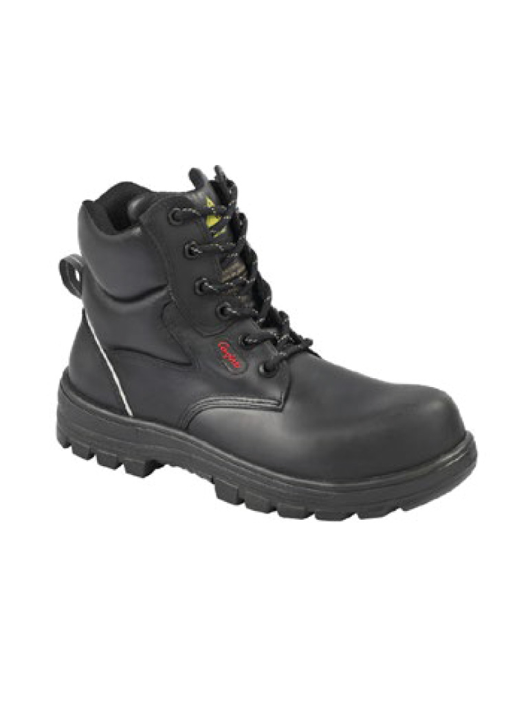 Occupational boots made of pull up greased leather, lace up model and medium-padded shaft with two tubes. Plastic eyelets in high resistance. Tongue type wing of bat, coated with fabric and foam. Upper inner lining with nonwoven and also an inner coated in needled fabric with sweat-absorbing and antimicrobial properties. Reective strip on the back. It has removable inner insole shaped in EVA with antimicrobial treatment. Indicated for areas that present low risks, ensuring comfort and protection with uniformity to the user’s feet.